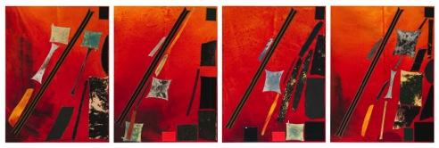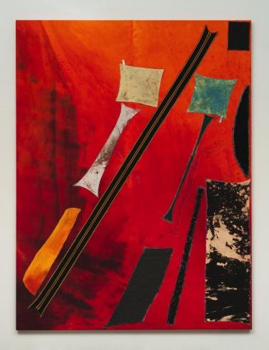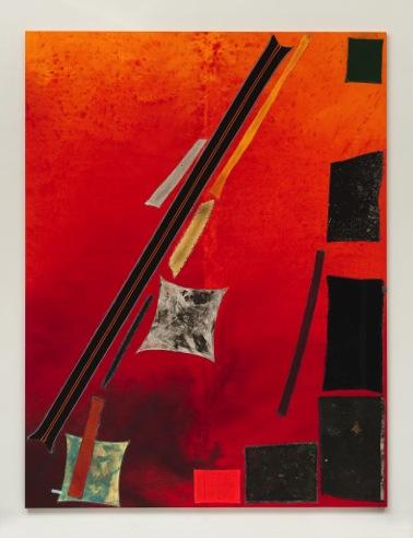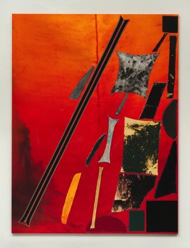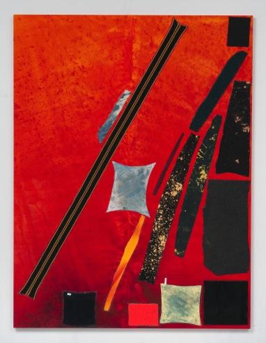 Tissu, colle, peinture, toile teinte sur panneau