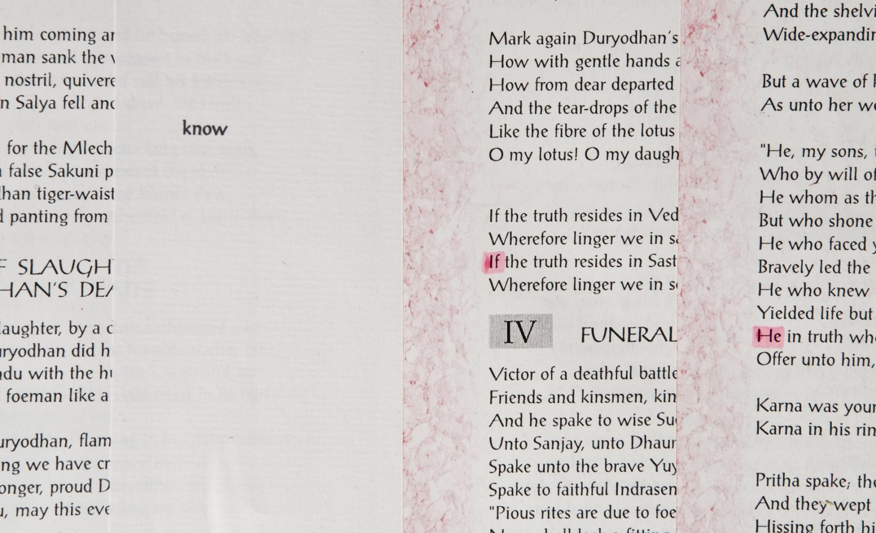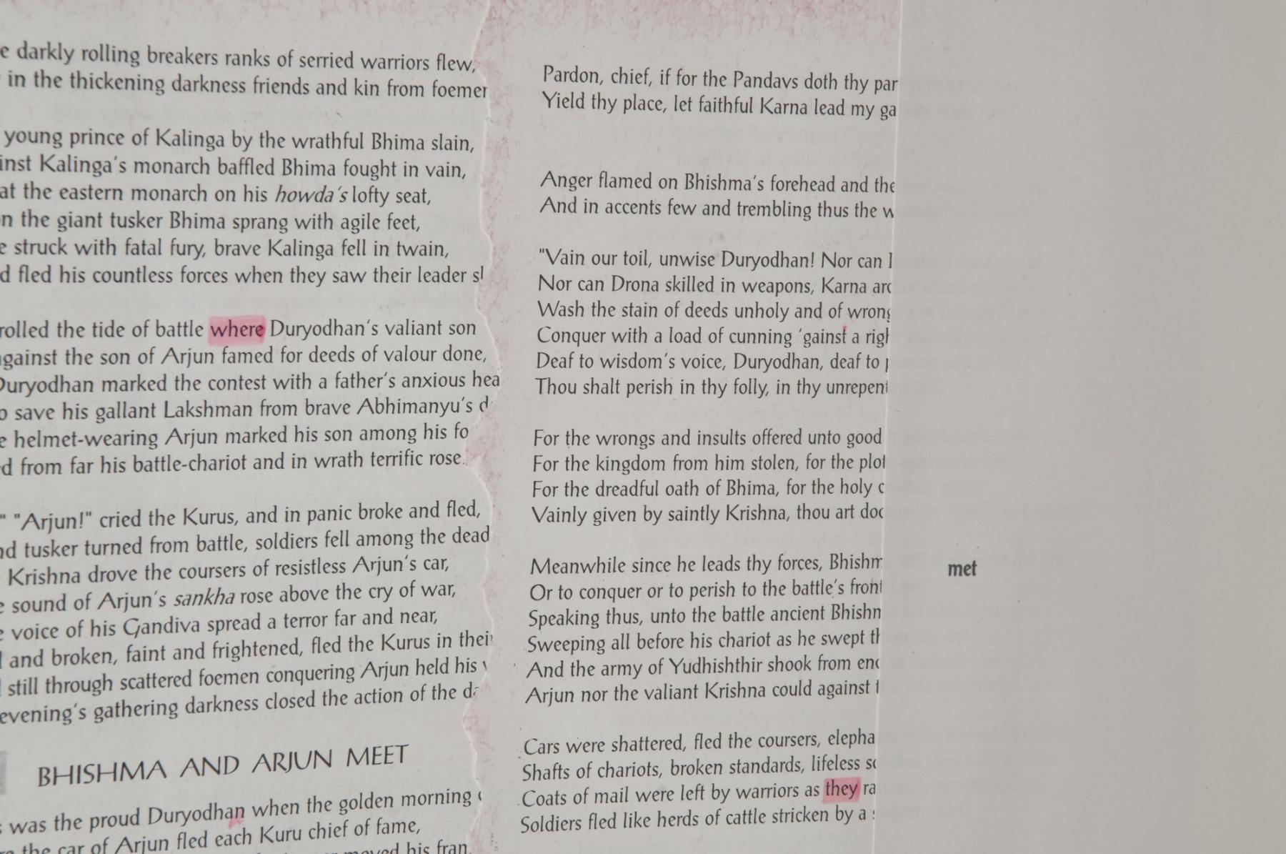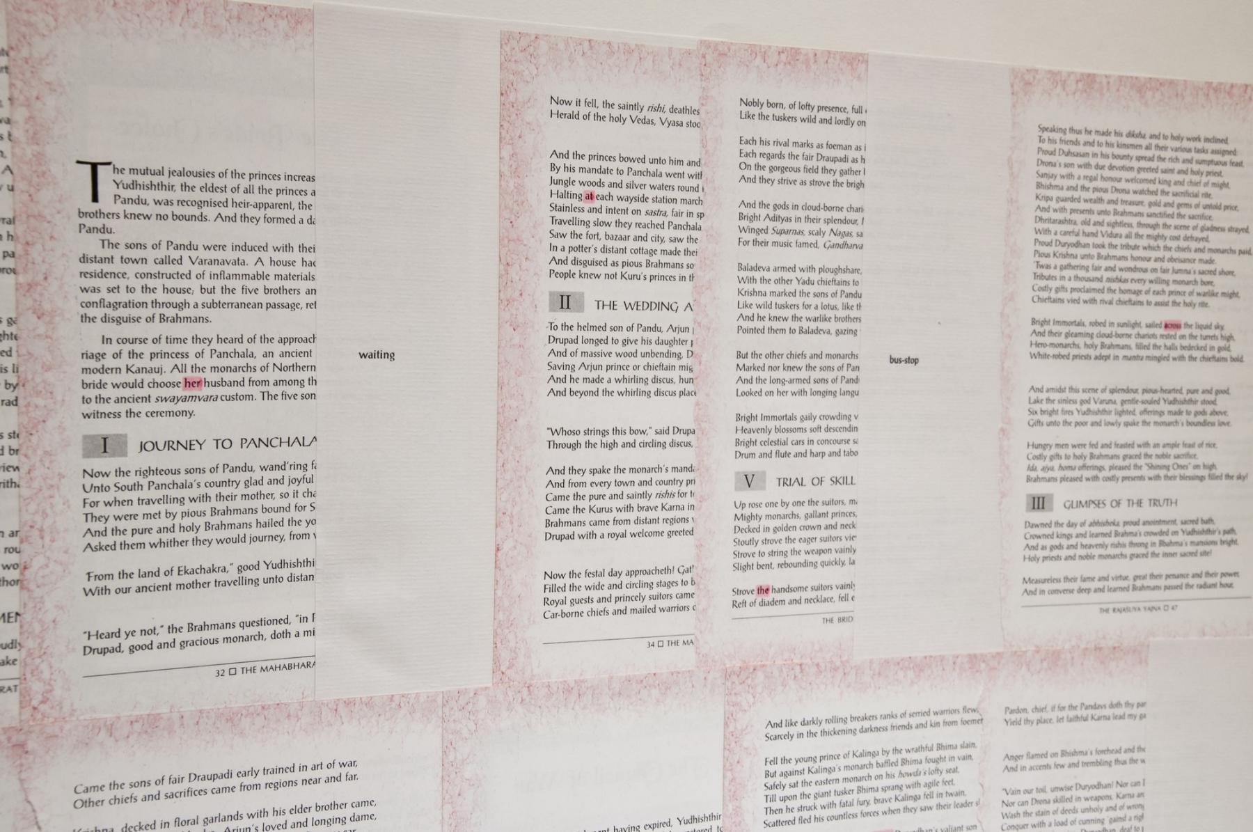 Livre Mahabharata, pages du livre Mahabharata, impression sur papier, banc en bois